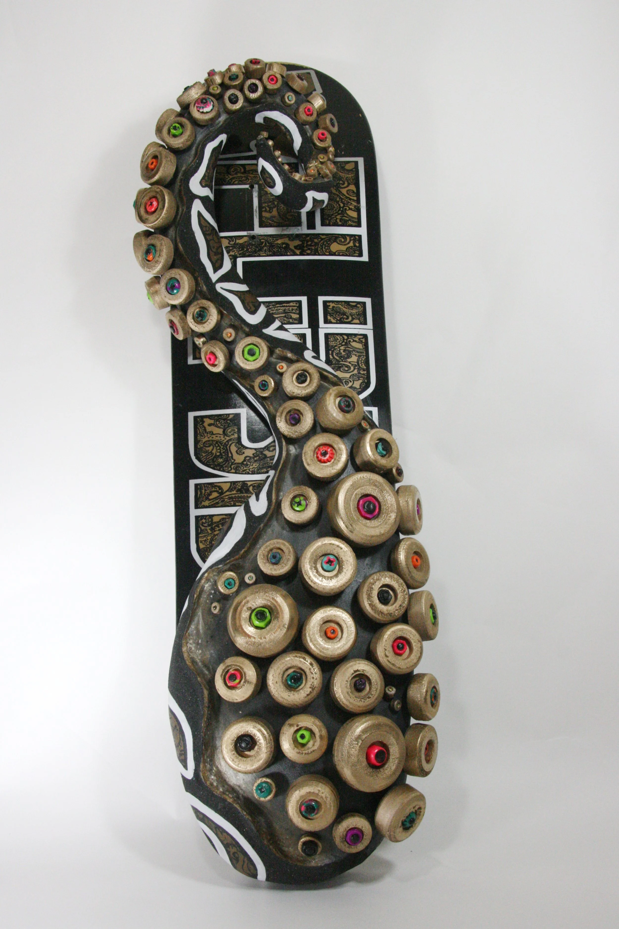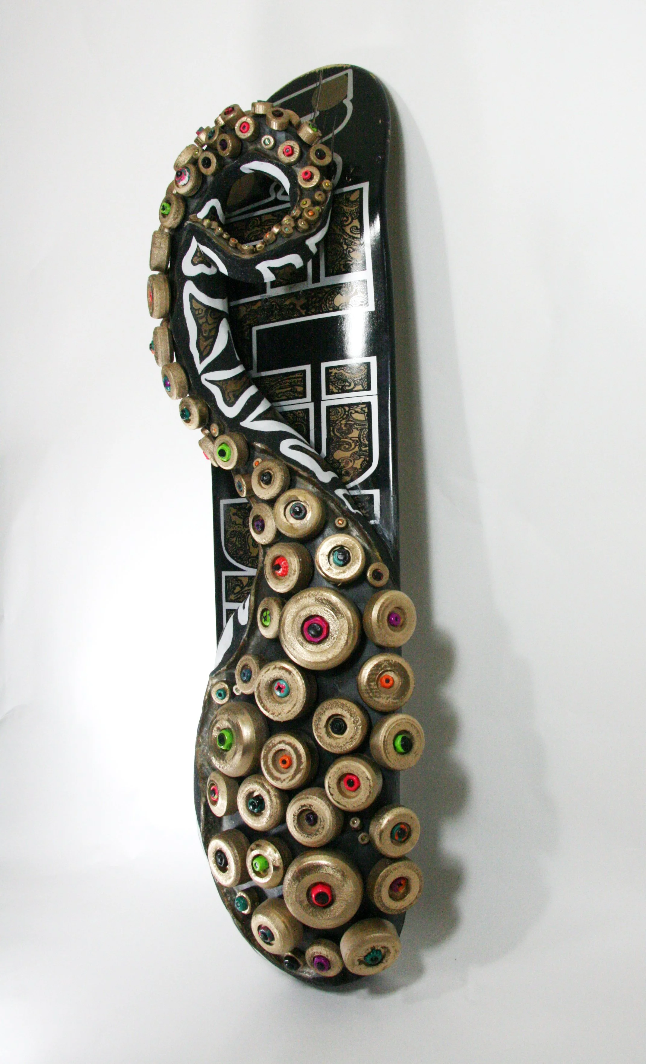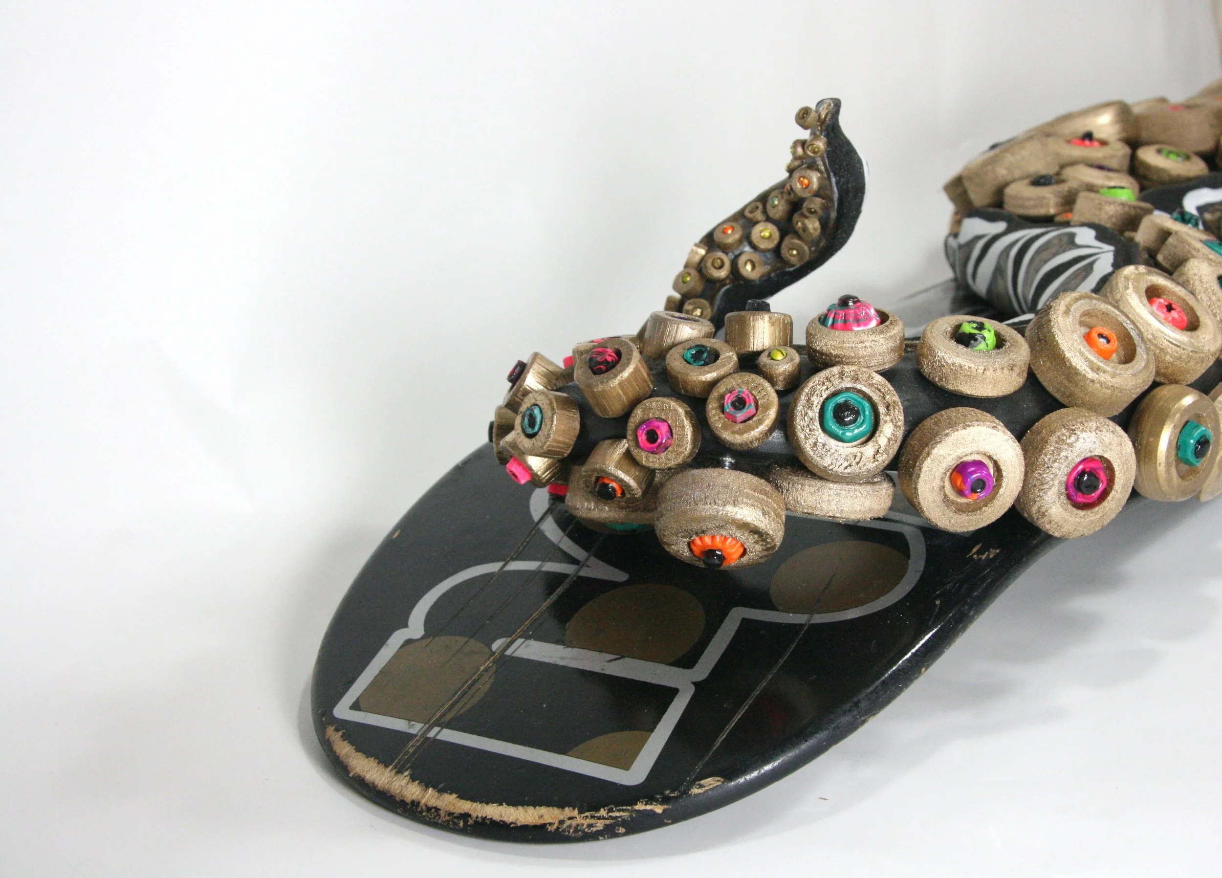 found skateboard, found maple, found poplar, hardware, polymer clay, acrylic paint, sand, expanding foam